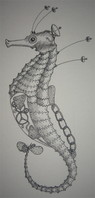 Beim Seepferdchen sollten wir ein Tier zeichnen, wie es mechanisch umgesetzt aussehen würde. Viele haben Tiger, Bären oder Gorillas gezeichnet. Das war mir zu langweilig und offensichtlich, deshalb habe ich mir für das Seepferdchen entschieden.