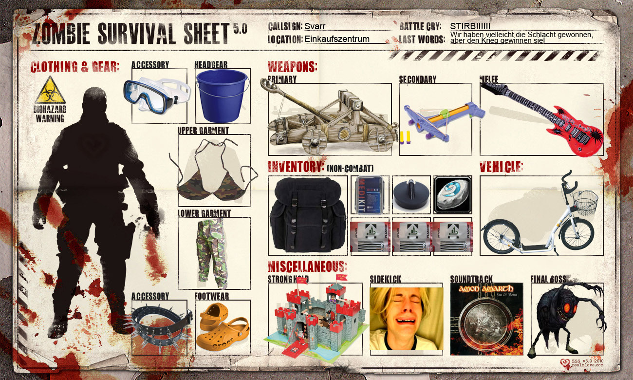 Also fühlt euch aufgefordert den Bogen (ernsthaft oder nicht) auszufüllen und euer Set-Up für eine nahende Zombie-Apokalypse hier zu präsentieren. :D